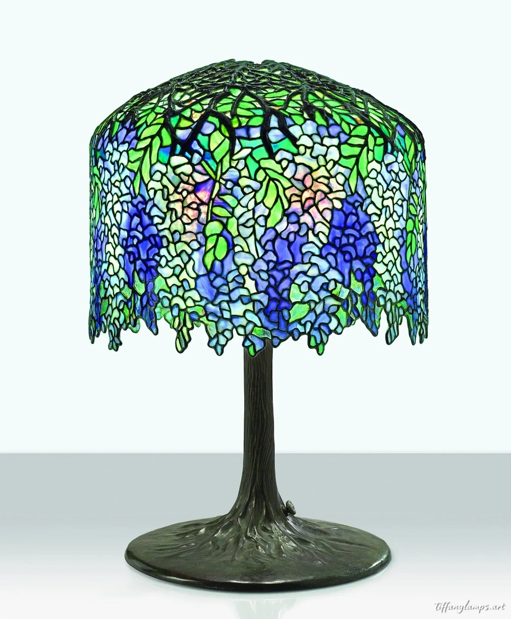 蒂芙尼“紫藤”台灯于 1905 年左右由 2,000 多块层叠玻璃制成,将在纽约 TEFAF 的 DeLorenzo 画廊展出。如今,此类物品的价格可能高达数十万美元,众所周知,在拍卖会上的售价远远超过 100 万美元。2018年,一盏“池塘百合”台灯在佳士得拍卖行以337万美元的价格成交。