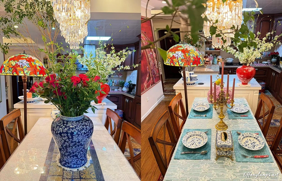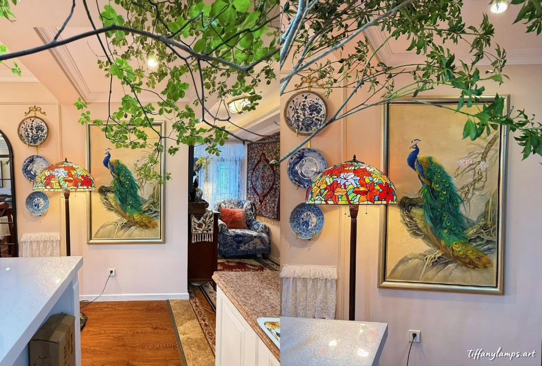 蒂凡尼灯的魅力,恰恰在于它能跨越时空,与多种风格对话。无论是与新中式瓷盘、古典孔雀图相伴,抑或与欧式烛台、蕾丝桌布共处,它始终以其独特的彩色玻璃工艺与手作温度,成为空间中那一抹不会褪色的亮点。它告诉我们:真正的风格,不在于固守某种范式,而在于敢于混合、叠搭,并在其中找到平衡。